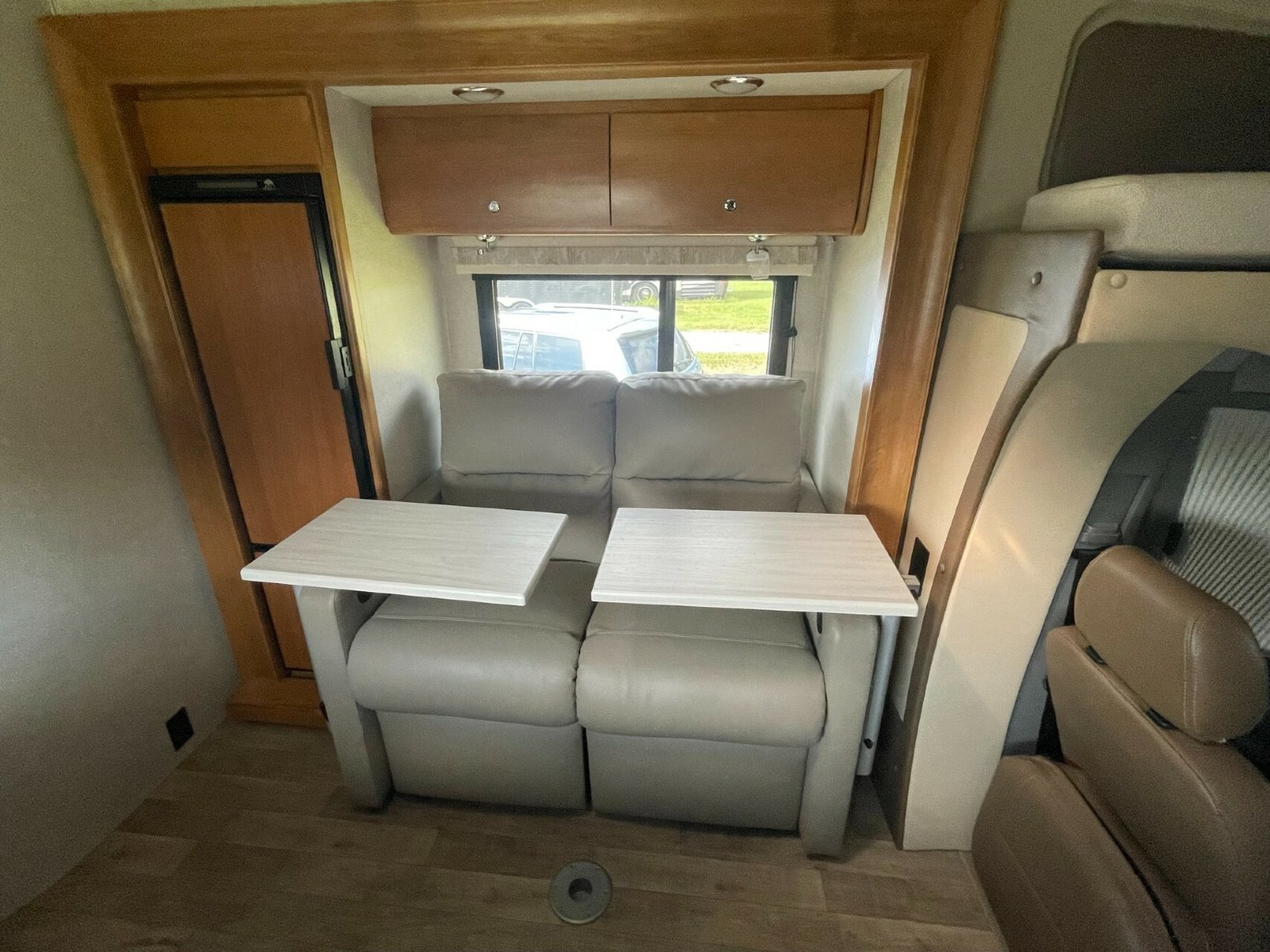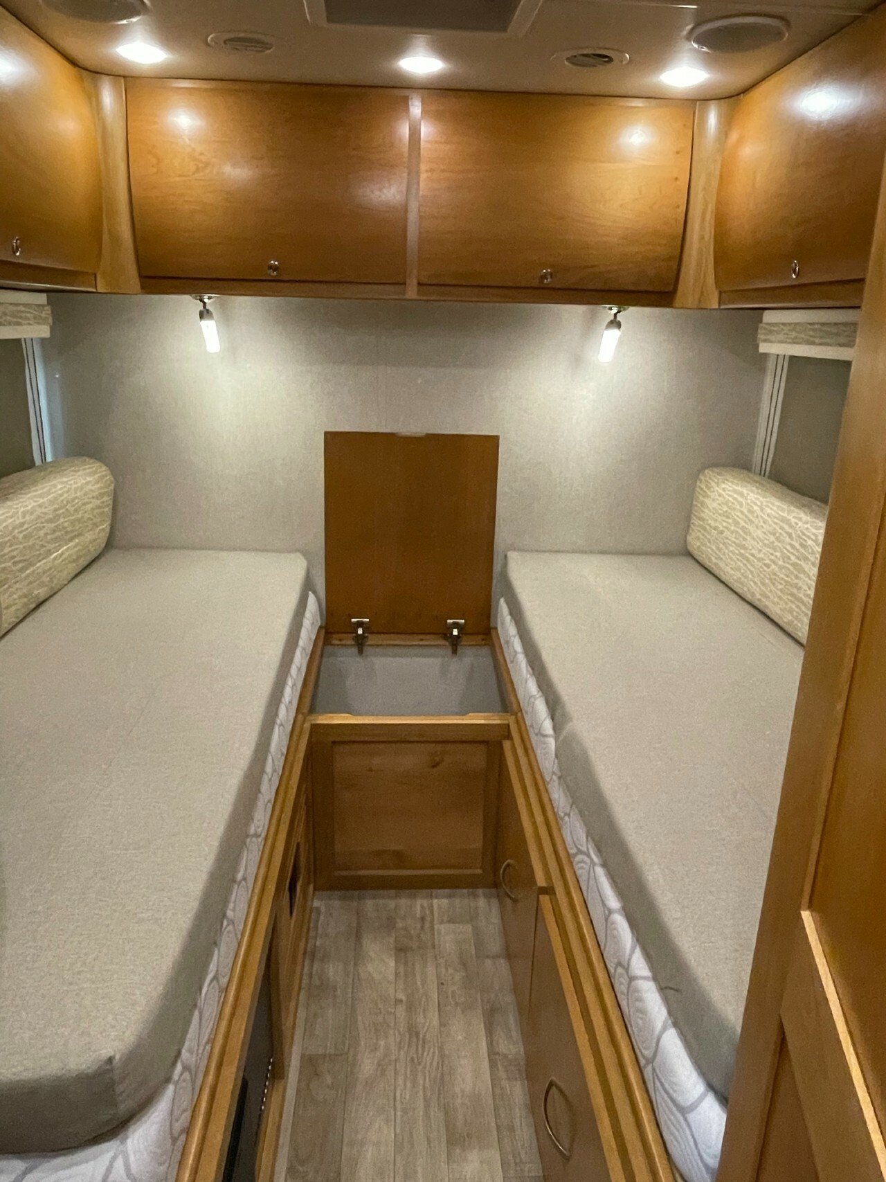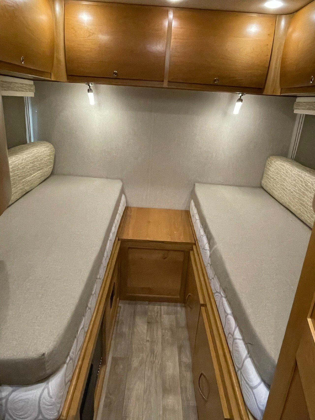 Experience trademark Tiffin craftsmanship in this quality built motorhome. This popular 24TW model allows access to all interior features without deploying the slide, perfect for boondocking. Twin rear beds convertible to king, a shower separate from the private toilet and vanity with sink.